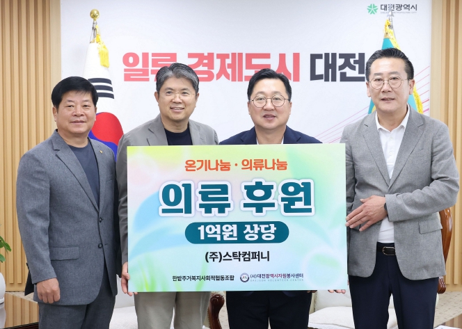 스탁컴퍼니는 14일 대전시청에서 한밭주거복지사회적협동조합에 1억 원 상당의 의류와 잡화를 기탁했다. 이날 기탁식에는 이장우 대전광역시장을 비롯해 이영선 스탁컴퍼니 대표, 이창섭 한밭주거복지사회적협동조합 대표, 김현호 대전광역시자원봉사센터장이 참석했다.