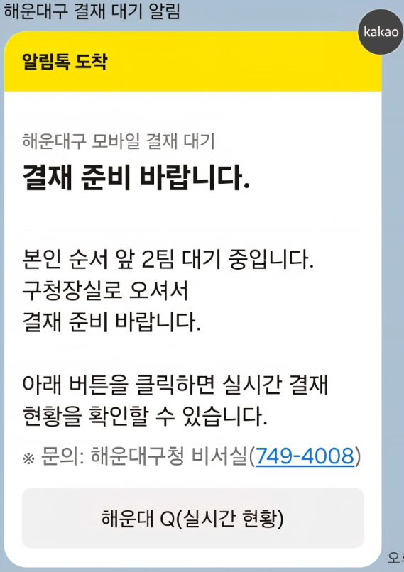 ‘해운대 Q’는 직원들이 직접 개발한 웹앱(Web app)으로, 기존 아날로그식의 결재 대기 방식을 모바일로 전환해 결재 대기 신청과 순번 안내를 카카오톡으로 받을 수 있도록 한 시스템이다. 이용자는 결재 시작 30분 전부터 모바일로 신청할 수 있으며, 실시간 결재 진행 상황도 확인할 수 있다.
