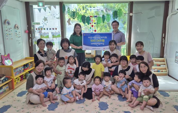 이번 성금은 SK베베어린이집이 7월 24일 원아, 학부모 및 교직원이 함께 관내 어려운 이웃을 돕기 위해 추진한 아나바다 바자회 행사 수익금으로 마련됐다.
