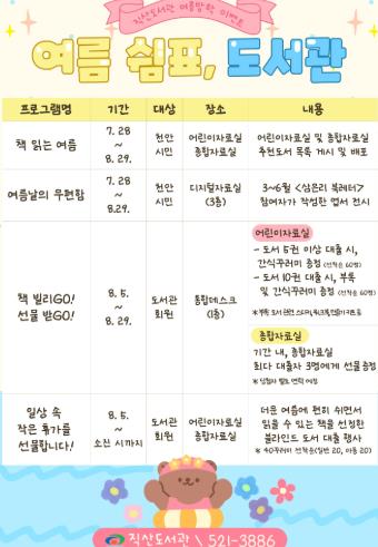 직산도서관은 도서관에서 일상 속 작은 쉼표를 찾고, 행복한 여름을 보낼 수 있도록 어린이부터 성인까지 모두가 함께하는 다채로운 행사를 마련했다.