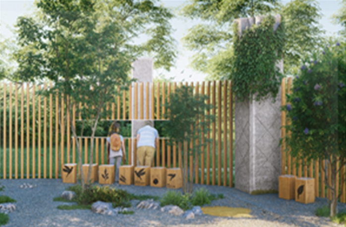 ‘Seoul Sojourn(인도)’은 서울에 잠시 머문다는 뜻으로, 전통적 한국 경관에서 시작해 호수 방향으로 이동할수록 네온사인과 K-pop 등 현대 서울의 이미지를 경험하도록 구성된다. 암석과 큐브 형태를 활용해 서울의 다이내믹을 표현한다.