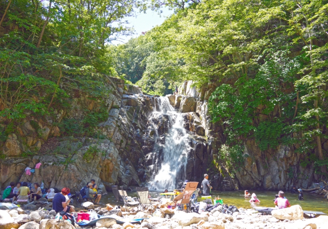 폭포 주변에는 넓은 계류와 하천변 공간이 마련돼 있어, 물놀이와 야영을 동시에 즐기려는 피서객들에게 큰 인기를 끌고 있다.