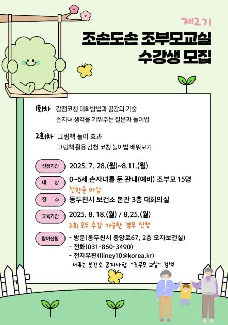 이번 프로그램은 8월 18일과 25일, 동두천시 보건소에서 진행되며 신청기간은 7월 28일부터 8월 11일까지이다. 0~6세 손자녀를 둔 관내(예비) 조부모를 대상으로 방문, 전화, 전자우편을 통해 선착순으로 모집한다.