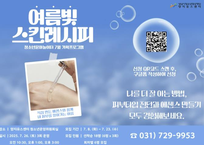 ‘여름빛 스킨레시피’는 지역 청소년 18명을 대상으로 하며, 현재 선착순 모집이 진행 중이다. 신청은 성남시청소년재단 홈페이지 또는 포스터의 QR 코드로 신청할 수 있다.