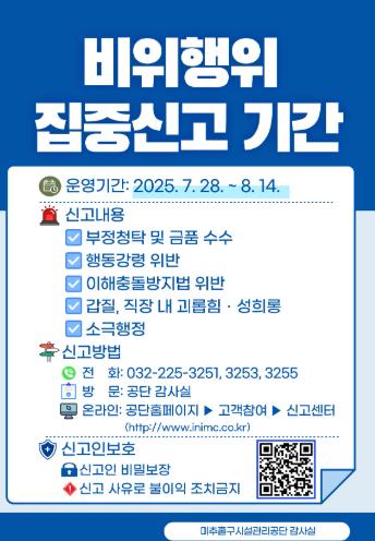 이번 집중 신고 기간은 공단 임직원과 협력업체를 대상으로 ▲부정 청탁 및 금품 수수, ▲이해충돌방지법 및 행동강령 위반, ▲갑질 및 직 내 괴롭힘 등의 비위행위를 예방하고 자율적인 신고 문화를 활성화함으로써, 청렴하고 인권이 존중되는 조직문화를 조성하기 위한 것이다.