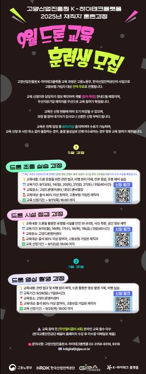 ‘항공 영상 촬영’과정은 9월 28일(8시간) 고양드론앵커센터에서 진행되며, 영상 촬영 기획, 비행 실습, 콘텐츠 제작 실무 등에 참여할 수 있다. 접수는 9월 25일까지 가능하다.