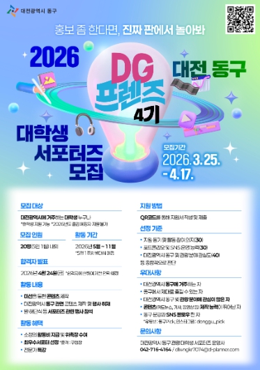 한편, 지난해 활동한 DG프렌즈 3기는 대전 동구동락 축제 홍보와 각종 SNS 콘텐츠 제작 등을 통해 동구의 관광 브랜드 가치를 높이는 데 기여한 바 있다.