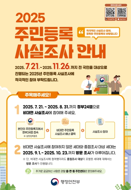 이번 주민등록 사실조사는 비대면-디지털 조사 또는 방문 조사 방식으로 진행되며, 주민등록상 거주지와 실제 거주지의 일치 여부를 확인하고 다양한 중점관리 대상의 현 거주 상황을 조사한다.
