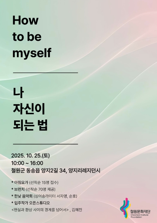 아침요가, 브런치, 음악회를 진행하며 입주작가 김혜진의 활동 결과 전시회 ‘현실과 환상사이의 경계를 넘어서’도 함께 운영한다. 아침요가는 10월 1일부터 사전접수를 통해 선착순 15명만 가능하고, 브런치는 행사 당일 선착순 70명에게 무료로 제공한다. 음악회는 SNS 팔로워 16만을 보유한 싱어송라이터 서자영, 가수 순호가 출연한다. 자세한 내용은 철원문화재단 홈페이지 및 SNS에서 확인 가능하다.