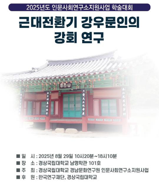 이번 학술대회는 지난 7월에 열린 ‘근대전환기 강우 문인의 기행과 시대인식’ 학술 행사의 연장선으로, 인문사회연구소지원사업 3차년 주제인 강우 문인의 강회 활동을 살피기 위해 마련됐다.