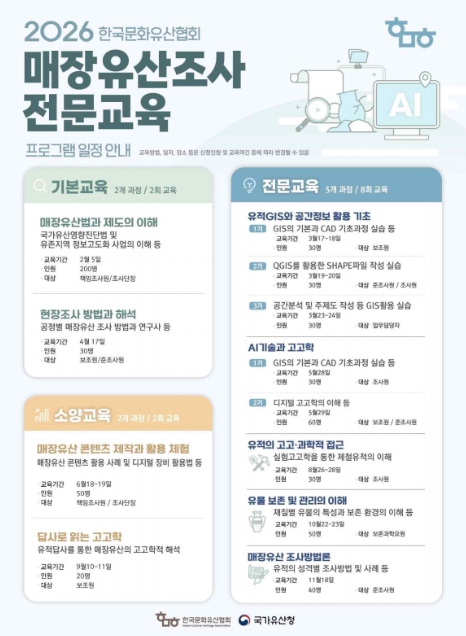 교육은 2월 5일 실시하는 ‘매장유산법과 제도의 이해’를 시작으로 3개 분야 9개 과정에 걸쳐 총 12회 진행된다. 매장유산 법령의 이해부터 현장조사 방법과 해석, 유적 지리정보시스템(GIS)과 공간정보 활용, 인공지능(AI) 기술과 고고학, 유물 보존 및 관리의 이해, 매장유산 콘텐츠 제작과 활용 체험 등 실무 전반을 아우르는 과정으로 구성됐다.