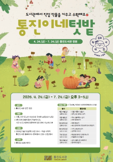 참가 대상은 가족이나 친구 등 2인 이상으로 구성된 팀(총 10팀)이며, 모든 프로그램 일정에 성실히 참여하고 자율적으로 텃밭 관리가 가능한 팀을 우선 모집한다. 참여자 모집은 3월 31일 오전 10시부터 통진도서관 누리집에서 선착순으로 진행된다.