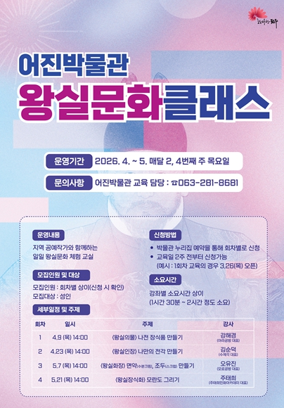 하재식 전주시 국가유산관리과장은 “많은 시민과 관광객들이 지역에서 접하기 어려운 왕실문화를 어진박물관 프로그램을 통해 우리 문화유산에 더 친숙해지고, 다양한 인문학적 소양을 쌓을 수 있길 바란다”고 말했다.