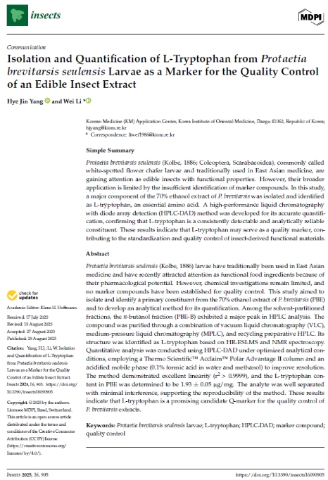 이번 연구 결과는 국제학술지(Insects, IF 2.9)에 논문으로 게재됐으며, 분획물과 관련해서는 한국한의학연구원과 함께 특허출원해 산업적 활용 가능성을 확보했다.