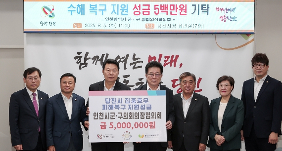 이번 성금 기탁은 인천광역시군구의회의장협의회 7월 월례회의에서 의원총회 행사에 사용할 예산 500만원을 수해로 고통받는 이재민들을 위한 성금으로 기탁하자는 안건에 대해 전원 찬성으로 추진됐으며, 피해 이재민들에 대한 깊은 위로와 조속한 일상 회복에 대한 희망을 담았다고 밝혔다.
