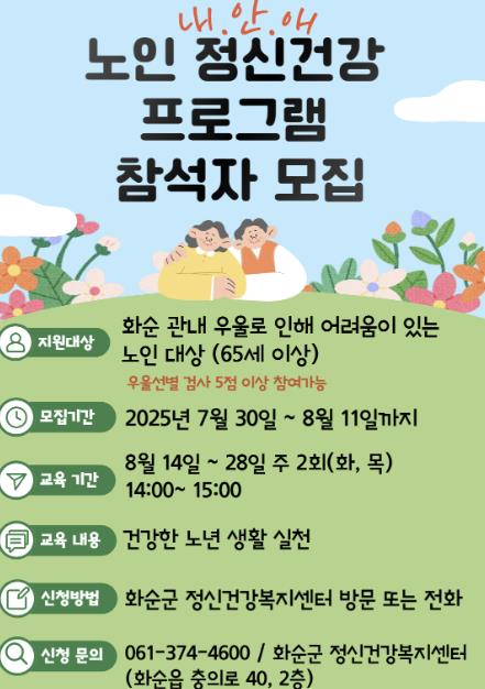 프로그램은 8. 14.부터 8. 28.까지 주 2회, 총 5회기로 운영된다. 참여 대상은 화순 관내 주민으로서, 우울로 인해 어려움이 있는 65세 이상 노인이며, 선착순으로 15명을 모집한다.