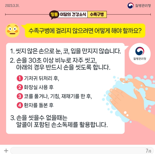 수족구병은 콕사키바이러스나 엔테로바이러스 감염에 의해 발생하는 급성 바이러스성 질환으로, 매년 여름철에 유행한다. 감염된 사람의 침, 가래, 콧물 등 호흡기 분비물이나 대변, 수포의 진물과 직접 접촉하거나 오염된 물건을 통해 전파된다. 수족구병은 현재 예방백신이 없어, 전파를 막기 위한 철저한 위생관리가 최선의 예방법이다.