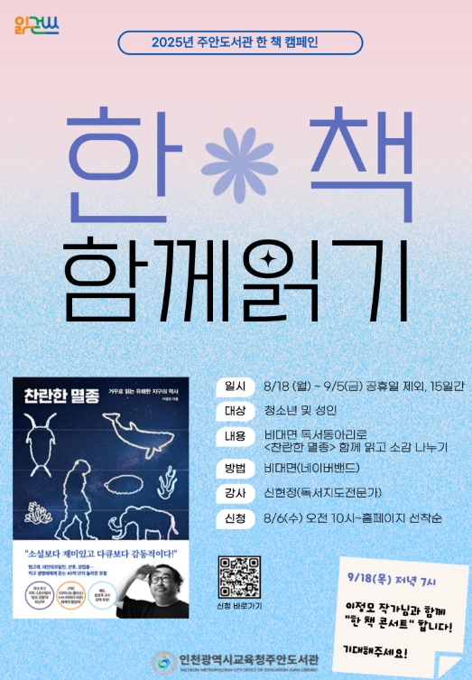 참여 신청은 8월 6일 오전 10시부터 주안도서관 누리집에서 가능하며, 프로그램 종료 후인 9월 18일 오후 7시에는 이정모 작가와 함께하는 ‘한 책 콘서트’도 진행될 예정이다.
