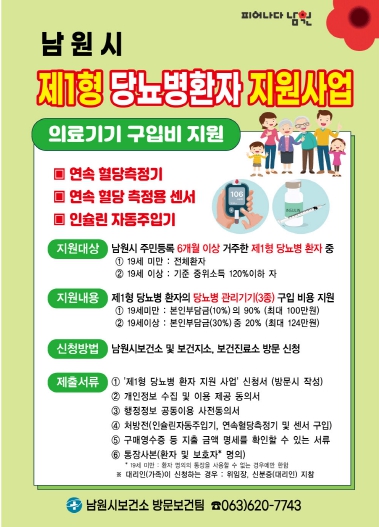 남원시보건소(소장 한용재)는 “제1형 당뇨병은 꾸준한 관리가 필요한 질환인 만큼, 이번 사업이 정밀 인슐린 펌프 등 고가 기기 구매에 실질적인 도움이 될 것”이라며 “이를 통해 환자들이 더욱 건강한 일상을 누릴 수 있기를 기대한다”라고 밝혔다.