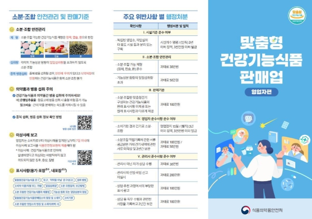참고로 식약처는 맞춤형 건강기능식품에 대한 이해도를 높이기 위해 맞춤형 건강기능식품 소분·조합 안전관리, 이상사례 보고 및 표시사항, 주요 위반사항 등을 안내하는 ‘맞춤형 건강기능식품 법령·제도 등에 관한 종합안내서’를 발간했으며, 자세한 내용은 식약처 누리집이나 식약처 식품안전나라 누리집에서 확인할 수 있다.
