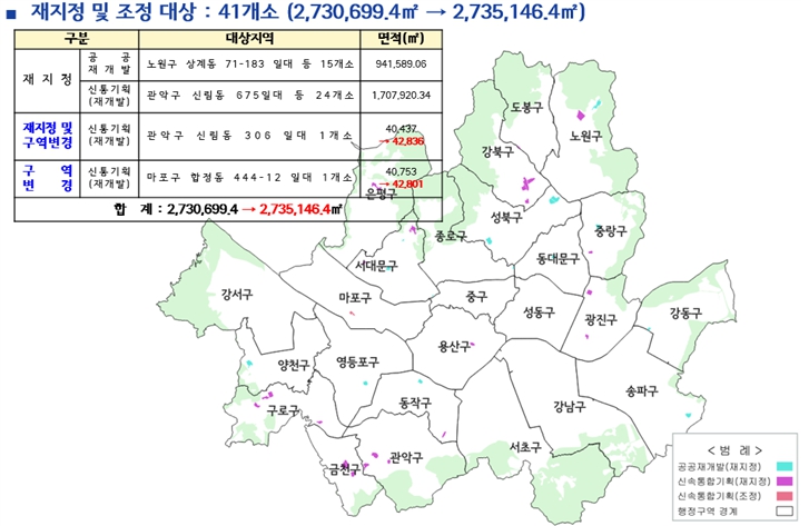 또한, 지정기간이 만료될 예정인 기존 공공재개발 15곳, 신속통합 재개발 25곳 등 총 40곳에 대해서는 투기수요 유입 방지를 위해 2027년 4월 3일까지 재지정했다. 이 중 신속통합기획 주택재개발 구역인 관악구 신림동 306 일대는 구역계가 변경됨에 따라 편입된 토지를 포함하여 토지거래허가구역을 조정(40,437㎡ → 42,836㎡)했다.