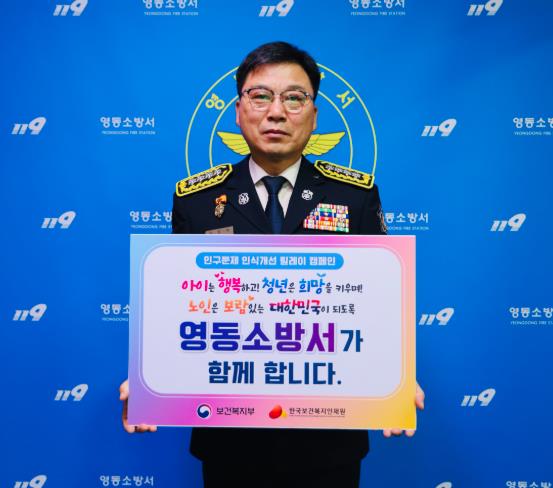 이날 이명제 서장은 류광희 옥천소방서장의 지목을 받아 ‘아이는 행복하고, 청년은 희망을, 노인은 보람을 느끼는 대한민국’이 적힌 피켓을 들고 전 국민의 관심과 참여를 호소했다.