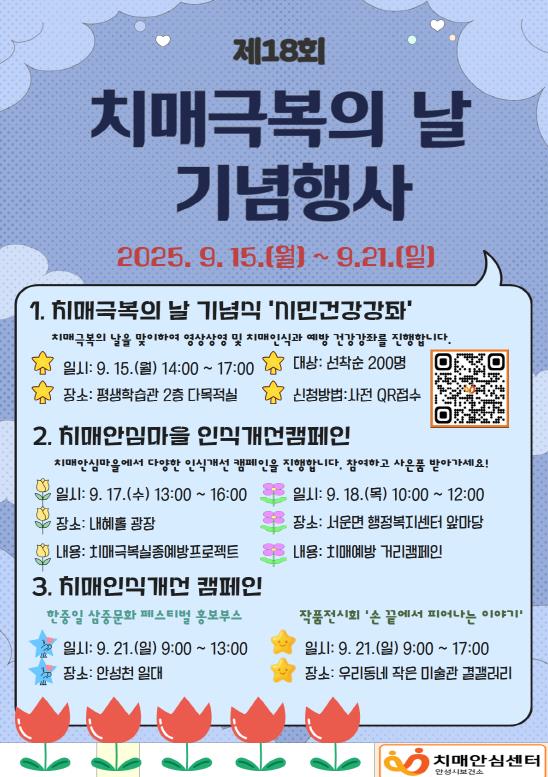 기념식은 평생학습관 2층 다목적실에서 진행되며 ▲치매극복의 날 영상 상영 ▲포토존 운영 ▲경기도의료원 안성병원 시민건강강좌(치매인식개선과 예방) 등 시민이 참여할 수 있는 다양한 프로그램이 마련된다.