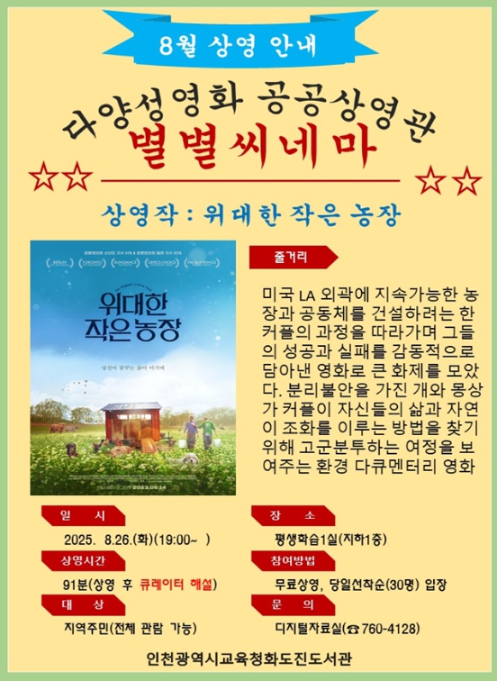 프로그램은 11월까지 매월 넷째 주 화요일 오후 7시, 화도진도서관 평생학습 1실에서 진행되며, 8월 26일 상영작은 존 체스터 감독의 ‘위대한 작은 농장’이다.