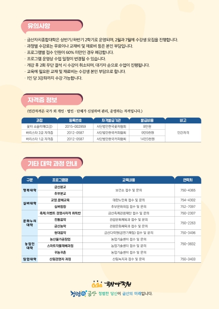 금산다락원 관계자는 “단순 취미·소양 강좌보다는 지역사회에 활용할 수 있는 교양 강좌 및 창업 관련 과정을 제공해 자기 발전 및 사회공헌에 기여할 수 있는 인재 양성에 도움을 줄 것”이라고 말했다.