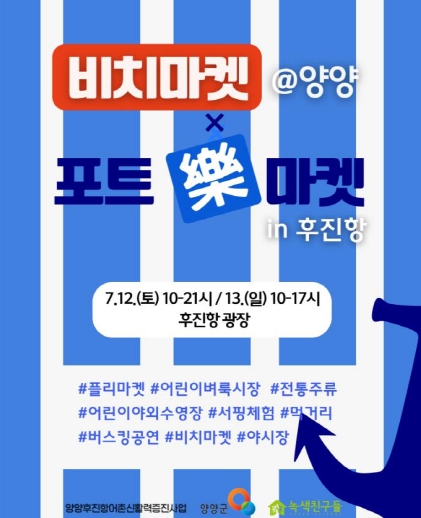 양양의 대표 플리마켓인 ‘비치마켓 @양양’과 후진항 어촌신활력증진사업단이 함께하는 『비치마켓 @양양 X 포트락 마켓 in 후진항』 행사가 오는 7월 12일과 13일 이틀간 후진항 광장에서 열린다.