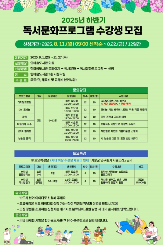 이번 프로그램은 9월 1일부터 11월 27일까지 운영되며 군민들의 교육 및 문화생활 증진을 위한 다양한 프로그램이 운영될 예정이다.