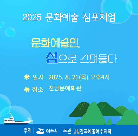 특히 이번 행사는 여수시가 주최하고 (사)한국예총 여수지회(지회장 신지영)가 주관하며, 지역 문화예술인의 참여와 연대를 통해 섬박람회와 연결되는 다양한 예술적 비전과 아이디어를 공유하는 자리가 될 예정이다.