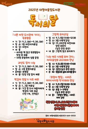 대명어울림도서관 독서의 달 행사와 관련된 사항은 대명어울림도서관 누리집 또는 SNS를 확인하거나 전화로 문의하면 된다.