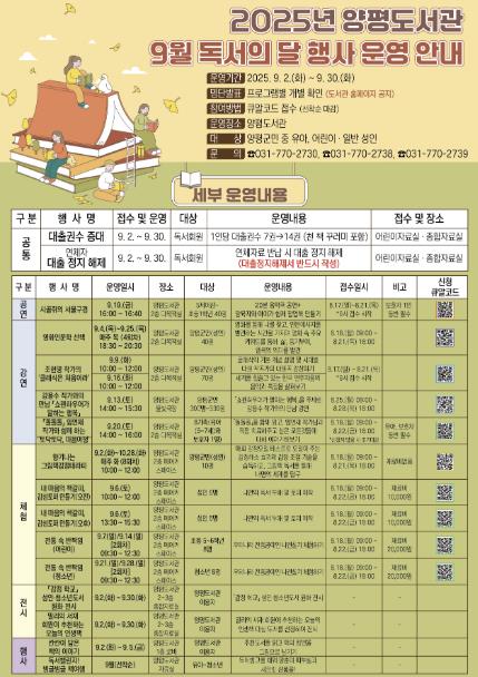 전진선 양평군수는 “9월 독서의 달을 맞이하여 도서관에서 진행하는 다채로운 독서 문화 행사를 통해 주민들이 도서관과 더욱 가까워지고, 문화적 풍요로움을 함께 누리기를 바란다”라고 전했다.