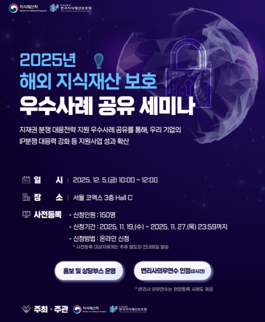 지식재산처 박진환 지식재산분쟁대응국장은 “해외 시장에서의 지식재산 분쟁은 기업이 직면할 수 있는 핵심 리스크로, 선제적 대응 역량 확보가 무엇보다 중요하다”며, “이번 세미나가 실효성 있는 대응 전략을 배우는 소중한 계기가 되기를 바라며, 지식재산처는 우리 기업들의 지식재산 보호를 위한 든든한 동반자가 되도록 지속적으로 노력하겠다”고 밝혔다.
