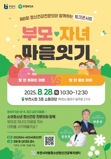 김은옥 부천시보건소장은 “부모와 자녀 간 건강한 소통은 아이의 정서 발달과 자존감 형성에 큰 영향을 준다”며 “이번 토크콘서트가 양육자에게 실질적인 도움이 되고, 부모와 자녀의 마음을 잇는 계기가 되길 바란다”고 말했다.