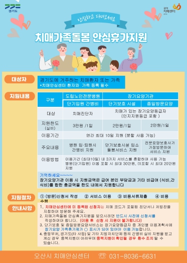 이 제도는 기존 ‘장기요양가족휴가제’ 이용 시 발생하는 본인부담금을 경기도가 지원하는 형태로, 경기도 내 치매안심센터에 등록·관리 중인 치매환자 또는 가족이 경기도민이면 누구나 신청 가능하다.