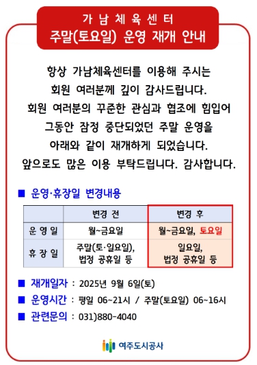운영 시간은 평일(오전 6시 ~ 오후 9시), 토요일(오전 6시 ~ 오후 4시)까지 운영이며, 이번 조치로 공공체육시설의 접근성과 활용도가 높아질 것으로 보이며, 특히 가족 단위 이용객이나 직장인 등 다양한 계층의 시민들이 편리하게 운동할 수 있는 환경이 조성될 전망이다. 참고로, 여주국민체육센터는 일요일(오전6시 ~ 오후 4시)까지 운영이 된다.