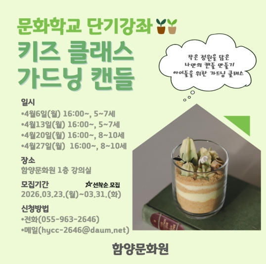 이번 강좌는 짧은 기간 동안 부담 없이 참여할 수 있도록 기획된 프로그램으로 성인 대상 글라스아트와 유아 대상 가드닝 캔들 체험으로 구성됐다.