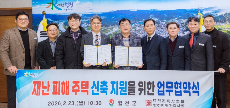 김윤철 합천군수는 “이번 업무협약은 재난 피해주민들이 하루빨리 안정된 보금자리로 돌아갈 수 있도록 행정과 전문가가 함께 힘을 모은 결과”라며 “앞으로도 민·관 협력을 통해 재난 대응과 주거 복구 지원에 최선을 다하겠다”고 말했다.