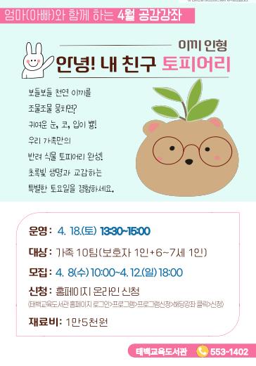참여 신청은 4월 8일 10시부터 12일 18시까지 태백교육도서관 누리집을 통해 신청할 수 있으며, 재료비는 참여자가 부담해야 한다.