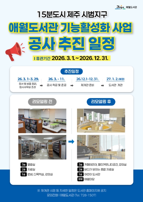 이번 리모델링은 노후 시설을 개선하고 도서관 기능을 강화하기 위해 추진된다. 애월도서관은 공사 기간 중 지역 주민의 독서 접근권을 보장하고 이용 공백을 최소화하고자 애월읍 체육관 2층 다목적실에 임시 자료실을 마련해 임시 서비스를 제공할 방침이다.