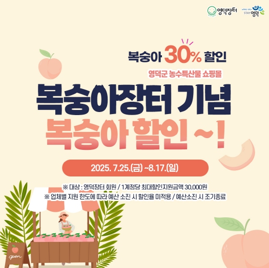 이에 이벤트 기간 구매자는 영덕 복숭아를 30% 할인된 가격으로 구매할 수 있으며, 신규 회원으로 가입하면 2,500원 할인 쿠폰도 추가로 제공받을 수 있다.