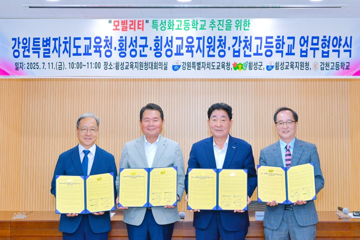 횡성군은 11일, 횡성교육지원청에서 강원특별자치도교육청(교육감 신경호), 횡성교육지원청(교육장 심영택), 갑천고등학교(교장 권상문)와 함께 ‘갑천고 특성화고 전환을 위한 업무협약’을 체결한다.