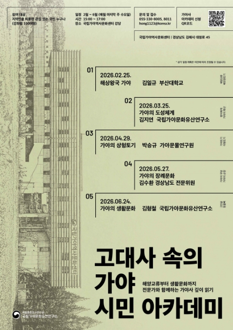 '고대사 속의 가야' 시민 아카데미는 단순히 역사를 배우는 것을 넘어, 우리 고대사의 한 축인 ‘가야’의 가치를 재발견하고 이를 시민들과 공유하기 위한 자리로, 국내 유수의 고고·역사 전문가들이 가야의 해양교류, 도성체계, 상형토기, 장례문화, 생활문화에 대해 깊이 있는 이야기를 들려줄 예정이다.