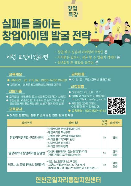 9월 13일에는 ‘실패를 줄이는 창업 아이템 발굴·분석법’ 특강을 통해 아이템 핵심 구조 분석, 고객 문제 정의, 수익 구조 설계와 고도화 전략을 실습 중심으로 배운다.