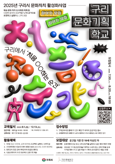 교육을 마친 참여자는 오는 12월 ‘구리시 문화 자치 주간 행사’에서 직접 기획한 프로젝트를 실행할 기회를 얻는다. 참여 신청은 8월 20일까지 구리문화재단 홈페이지 공고를 확인한 뒤, 네이버 폼 또는 지정 서식을 작성해 전자우편으로 접수하면 된다.