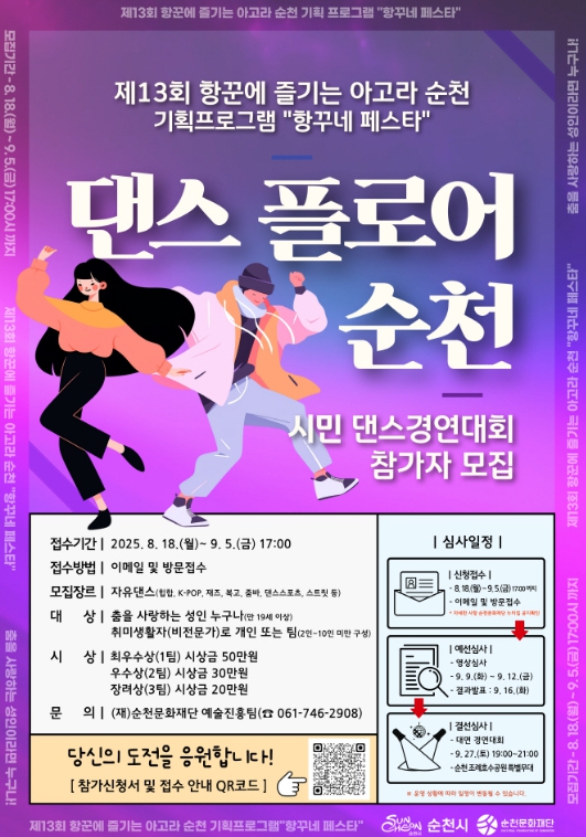 순천문화재단 관계자는“이번 경연대회는 시민 누구나 무대의 주인공이 되어 댄스를 통해 자신을 표현하고, 시민이 함께 즐길 수 있는 문화 축제를 만들고자 기획됐다”며, “무대에 서고 싶은 시민 누구나 참여할 수 있는 열린 경연인 만큼 많은 관심과 참여 바란다”고 밝혔다.
