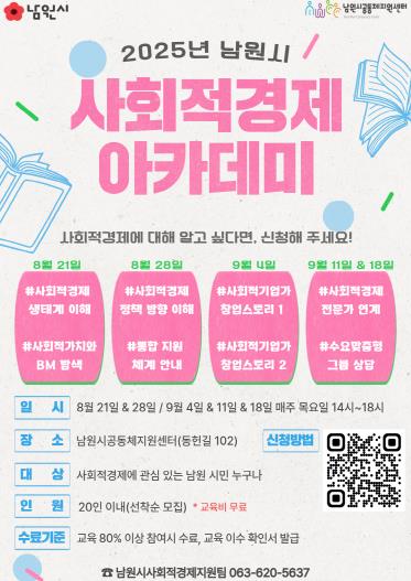 교육 일정은 8월 21일부터 9월 18일까지 총 5회 (매주 목요일 14시~18시) 남원시공동체지원센터에서 진행되며 교육비는 무료이다.