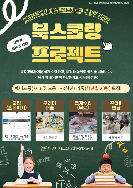 ‘북스쿨링’은 7세부터 초등 1~3학년 자녀를 둔 가족을 대상으로, 교과 연계 도서와 독후활동 키트를 통해 책 읽기와 체험 활동을 통합적으로 제공하는 달성도서관의 대표 독서프로그램이다.